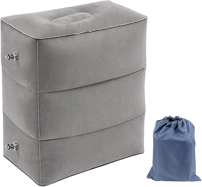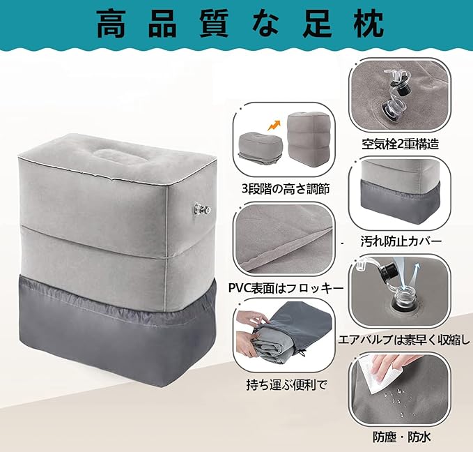 hengshao フットレスト 飛行機 足置き 足枕 エアー 子供 大人用 3段階高さ 足の疲れむくみ対策 エコノミー症候群 足休め エアーオットマン 携帯に便利 便利グッズ 収納袋付き 車用 クッション 飛行機 バス 家用 旅行 機内 デスク下 新幹線 (グレー)