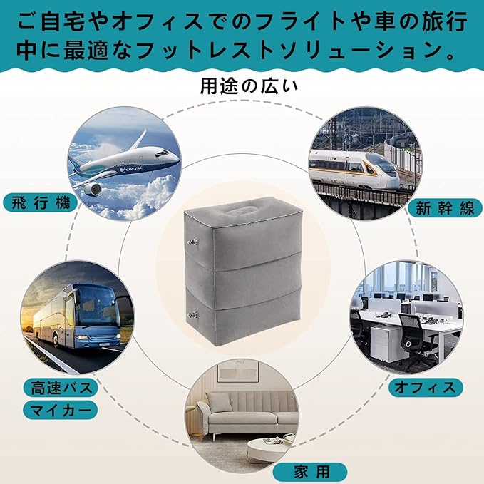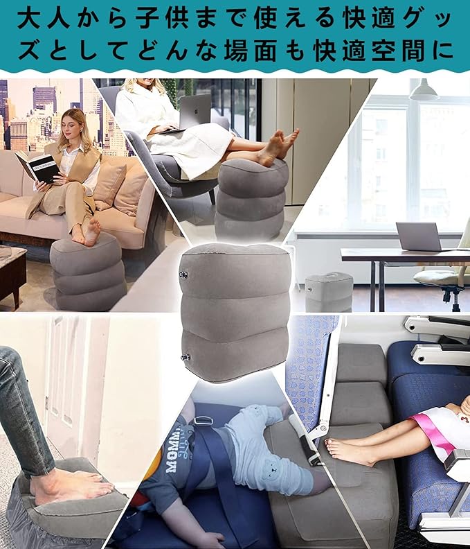 【幅広い用途】オフィスやお家での普段使いから、バス、新幹線、飛行機等の座りにくい座席も、足を伸ばすことによって体の疲れを軽減させます。また、お子様のお休みスペースとしても、待ち時間に疲れた時は椅子としても使用可能。キャンプなどのアウトドアシーンでも、フットレスト、簡易チェア、簡易枕にと幅広い用途でお使いいただけます。