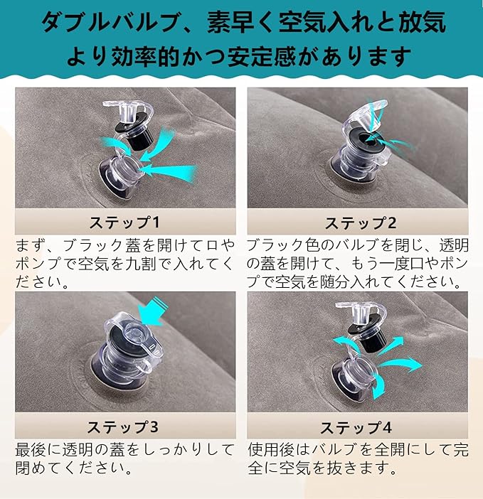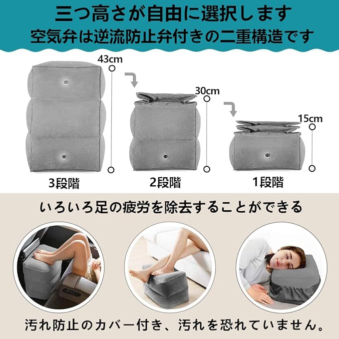 【3段階の高さ調節】弊社のフットレスト気弁は逆流防止弁付きの二重構造、一個三役足枕組み合わせので、空気量を調整することで、高さと硬さの調整が可能です。使う場所によって1段、2段、3段と自由に調節が可能な足枕です。