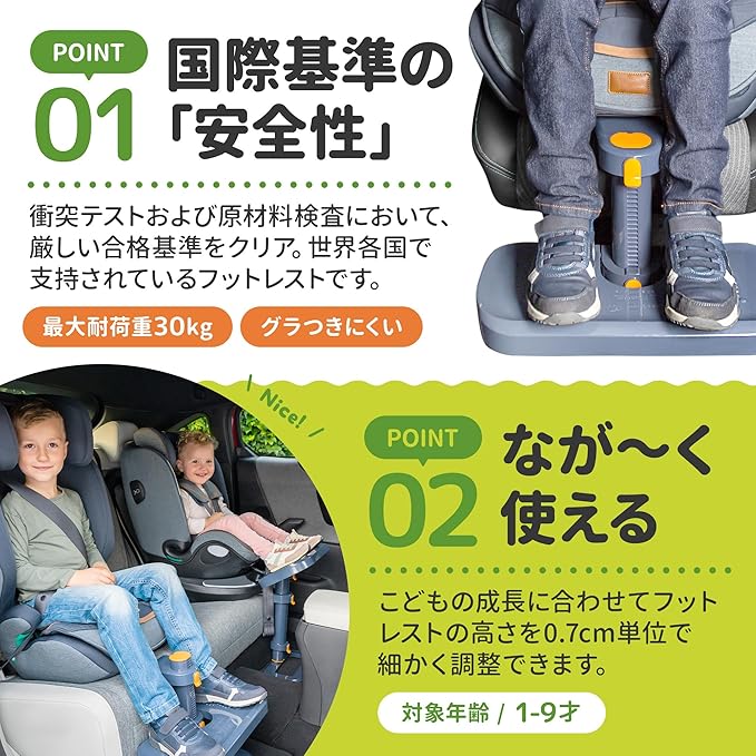 長く使える設計:お子様の成長に合わせて足置きボードの高さや角度を調整できるため、幼児期からジュニア期まで長期間にわたって快適に使用可能。