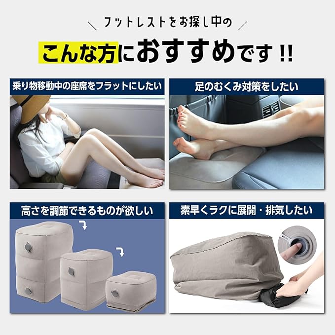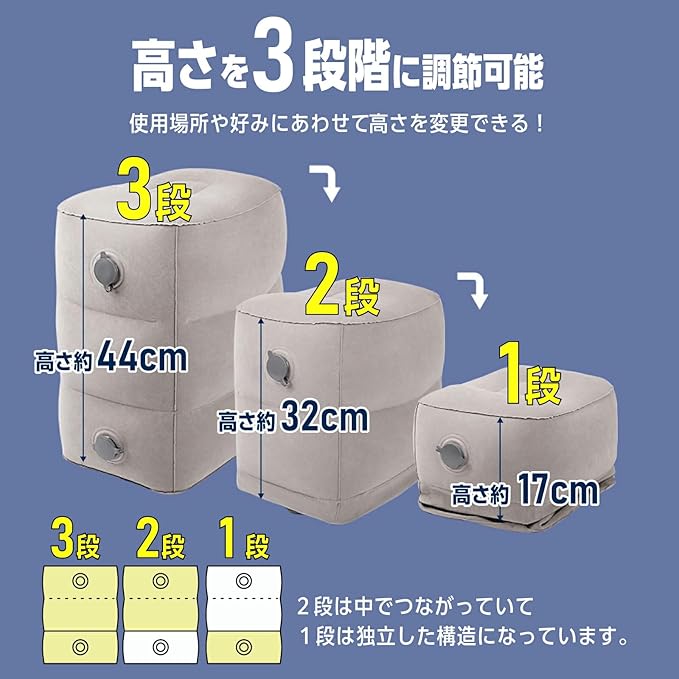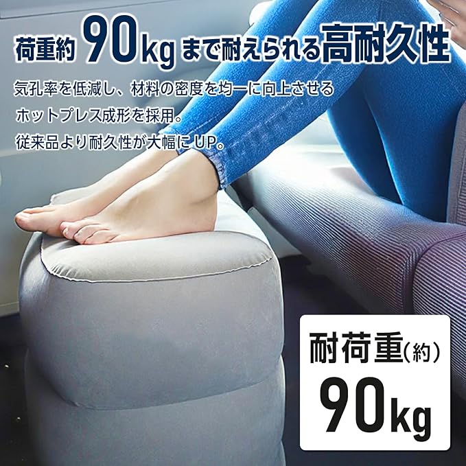 ・空気逆流防止弁付きで空気が抜けにくい。 ・コンパクト保管可能:収納時はクッション本体の空気を抜いて、折り畳んで保管できます。 ・多機能な収納袋付き:1.空気入れ2.底面の汚れ防止カバー3.収納袋の1つで3役。 ・足を置きやすいくぼみ加工&肌触りの良いベルベット調生地でリラックスできます。