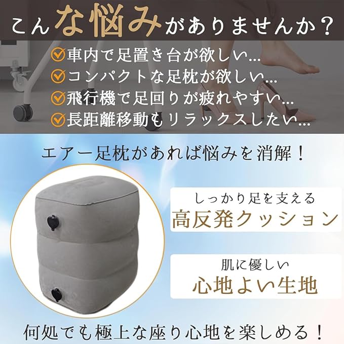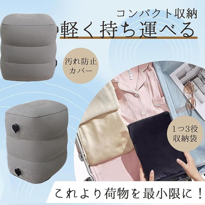 ✈【エアー 足枕&取扱簡単*便利】空気で膨らませるクッションで極力携帯便利ように、 空気を充填する道具が必要なく空気の吹き込みは楽になる、そしてバルプを押すだけでエアー調整が行えます。 充填時逆流防止構造です、短時間1分だけ空気を吹き込むことができます、そして、インフレータブル状態のから、 空気を抜いて畳めて、便利な収納バッグが付き、携帯しやすい。
