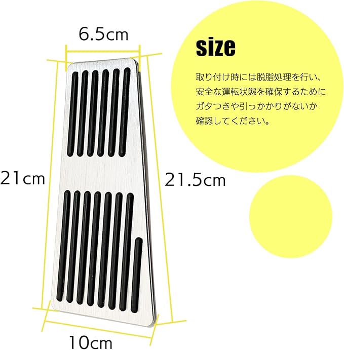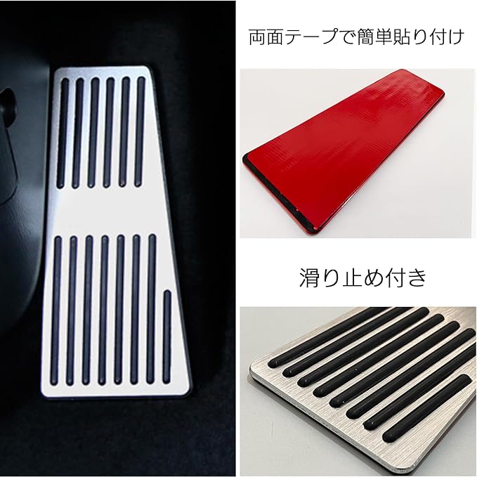 本製品は汎用品として設計されており、幅広い車種に取り付けが可能です。ただし、一部の車両では加工が必要となる場合がございます。既存のペダルに両面テープで簡単に装着できるため、手軽にドレスアップが実現します。取り付けに特別な工具は不要で、短時間で作業が完了するのも魅力です。