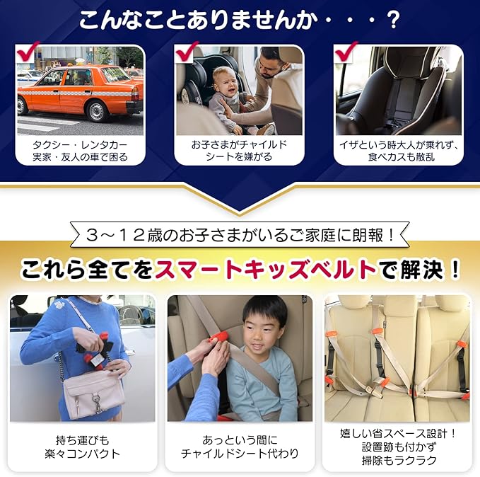 累計販売実績50万本突破!スマートキッズベルトは、ポーランドで開発され、EUやUS基準の厳しいクラッシュテストを経て安全認証を取得し、国内でもEマーク適合と認められた、世界で唯一の携帯型子供用シートベルトです。革新的な形状で携行性に優れ、旅先のレンタカーやタクシーの車内など、利用場所を選びません。製品の重さはわずかに120g。一般的なチャイルドシートと異なり幅も取らないため、後部座席に3人のお子様を乗せて使用できます。食べカスやチャイルドシート・ジュニアシートの設置跡が車に残るのが気になるご家庭にもおススメです。