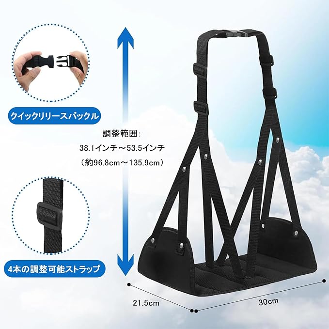 【簡単に取り付け可能】カラビナで機内のテーブルに吊り下げ、ストラップで長さ調整が可能。すぐに使用開始でき、快適な足元をサポートします。
