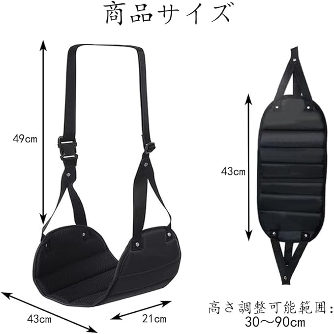 【商品仕様】:製品自体は長さが43CM*幅が21CM、調節可能な長さが30-90CMです。