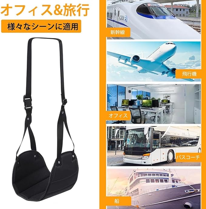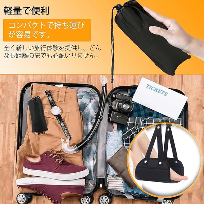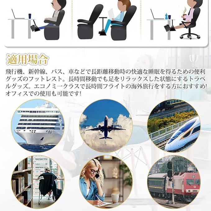 【広く使用する】:飛行機、新幹線、バス、車などで長距離移動時の快適な睡眠を得るための便利グッズのフットレスト。長時間移動でも足をリラックスした状態にするトラベルグッズ。