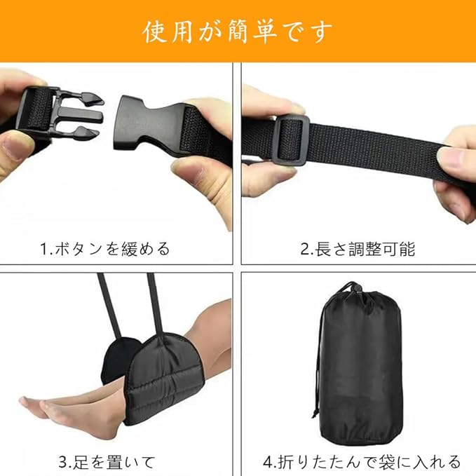 1.【商品仕様】:製品自体は長さが43CM*幅が21CM、調節可能な長さが30-90CMです。 2.【疲労回復】:この製品を使用することにより足の負担を軽減させむくみ等も軽減させます。旅行や出張の際にリラックスして疲れを軽減する。 また、膝の痛みにも効果的なフットベッドです。 3.【快適な素材】: フットレストには、高品質のベロア生地、スポンジ、ポリエステル生地が使用されています。 4.【使いやすさ】:取り付けは簡単で、座席の前に吊るすだけです。必要に応じて高さを調整し、個人の好みに合わせることができます。 5.【広く使用する】:飛行機、新幹線、バス、車などで長距離移動時の快適な睡眠を得るための便利グッズのフットレスト。長時間移動でも足をリラックスした状態にするトラベルグッズ。