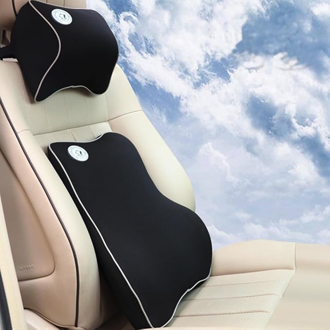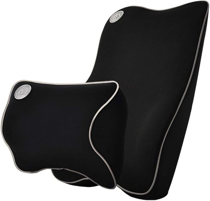 車のランバーサポートクッションとヘッドレストネックサポート枕、シートクッションバックレストクッション、低反発、調節可能な取り付けストラップ付き 洗える車の運転ゲームチェアオフィスコンピュータチェア、疲労を和らげる(ブラック)