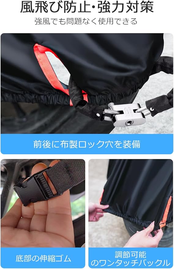【前後ロック穴&風飛び防止ベルト】前後にロック穴が設けられ、4cmの大きさであるため、様々な種類のロックを使用することができます。また、前後の風飛びを防止するためのベルトも装備されており、調節可能なため、バイクのサイズに合わせてフィットさせることができます。これにより、カバーが風でめくれたりすることを防止します。