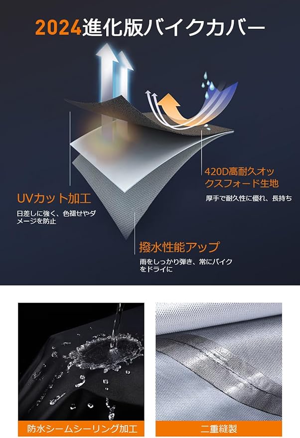 【高品質420D厚手素材と耐久性】2024進化版バイクカバーは、高品質な420D厚手ポリエステルオックス素材を使用。撥水加工と防水シームシーリング加工により、雨や雪からバイクを完全に保護します。二重縫製で強度が増し、裏地には耐熱素材を採用し、エンジンやマフラーの高熱からもカバーを守ります。これにより、長期間使用しても色あせや劣化が少なく、優れた耐候性と耐光性を持ちます。