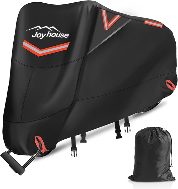 【防水性と撥水性の向上】耐水圧5000paの防水性を持ち、精密な二重縫い目とシームテープ加工で水の侵入を防ぎます。天井部に縫い目がなく、雨水がカバー内に溜まらず自然に流れ落ちる設計。これにより、急な雨や長時間の降雨でもバイクをしっかり守り、金属部分の錆びを防ぎます。