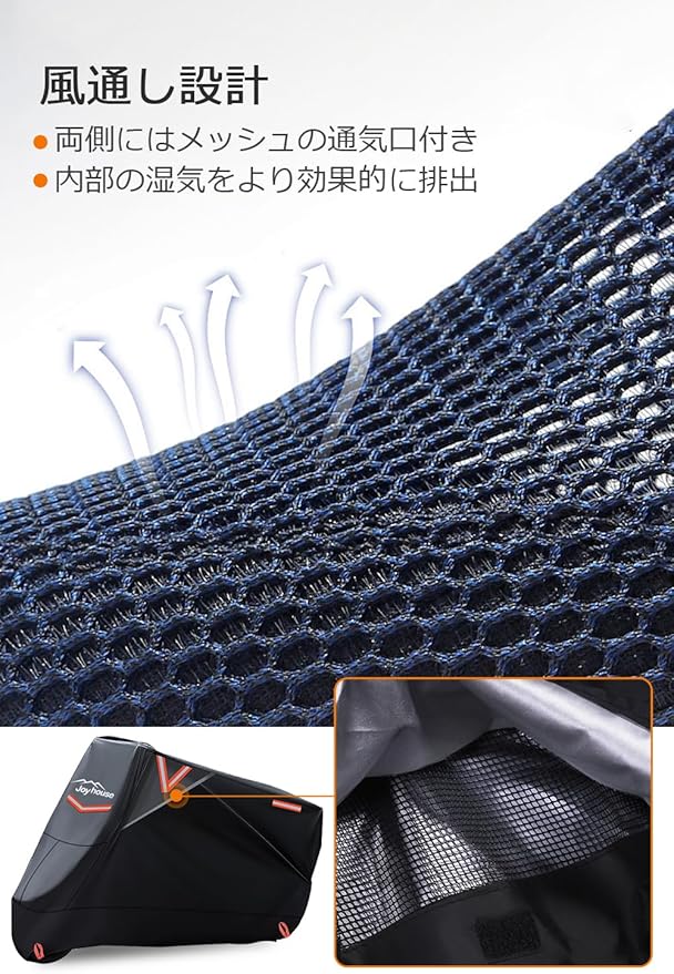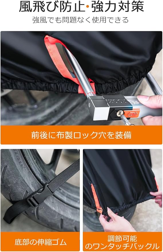 【通気性と防風性の確保】両側に通気口が設けられ、メッシュデザインで湿気を逃がし、バイクカバー内の蒸れを防止。雨上がりや梅雨時期でもバイクを乾燥した状態に保ちます。また、風飛び防止ベルトと裾絞りゴムを装備し、調節可能でバイクにぴったりフィット。強風でもカバーがズレにくく、しっかり固定されます。