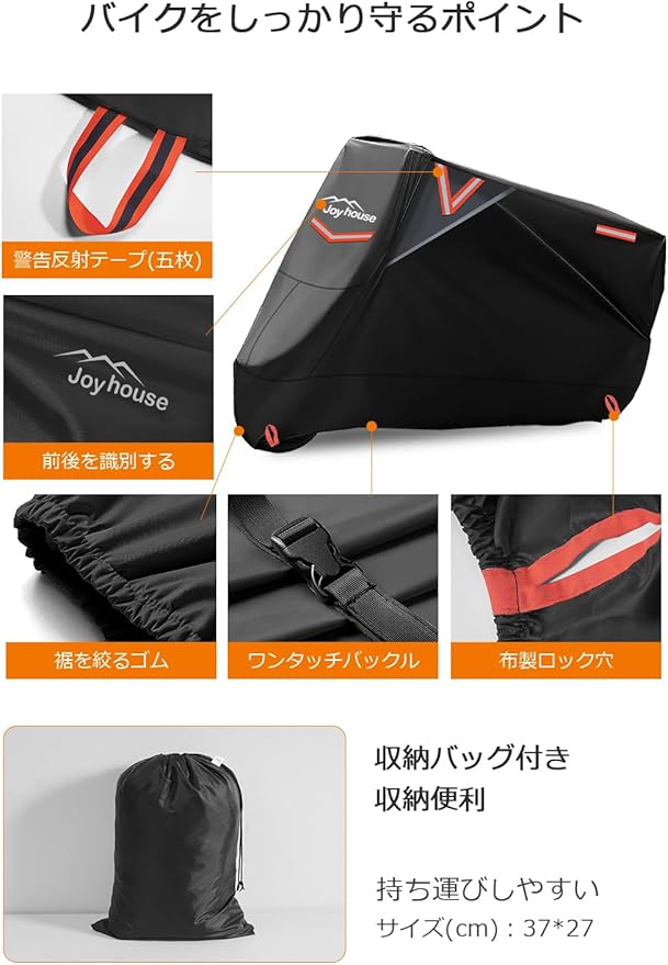 【便利な機能とサイズ展開】前後識別の反射テープとロゴで使いやすさを向上。収納バッグが付属し、持ち運びが簡単。出先でもバイクをしっかり保護します。サイズは4種類あり、スクーターから大型バイクまで対応。内部には滑らかな特別素材を使用し、バイクに傷が付きにくい設計で、装着時の摩擦を軽減します。(XL:220*125*100cm XXL:220*125*100cm 3XL:265*135*105cm 4XL:295*135*105cm