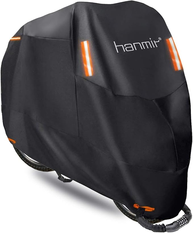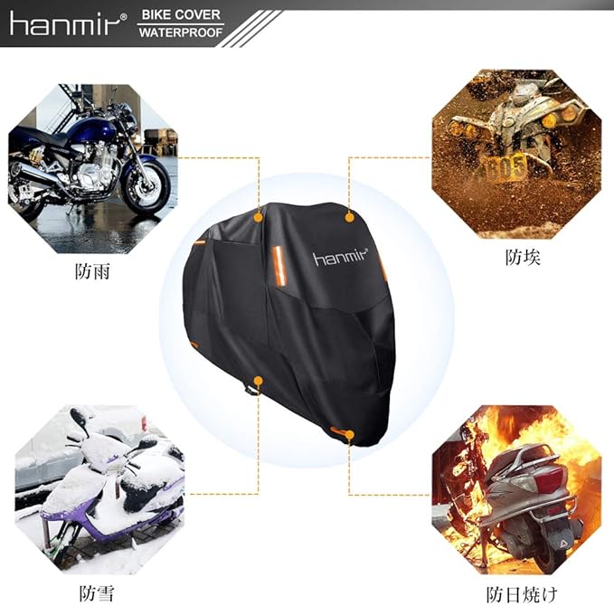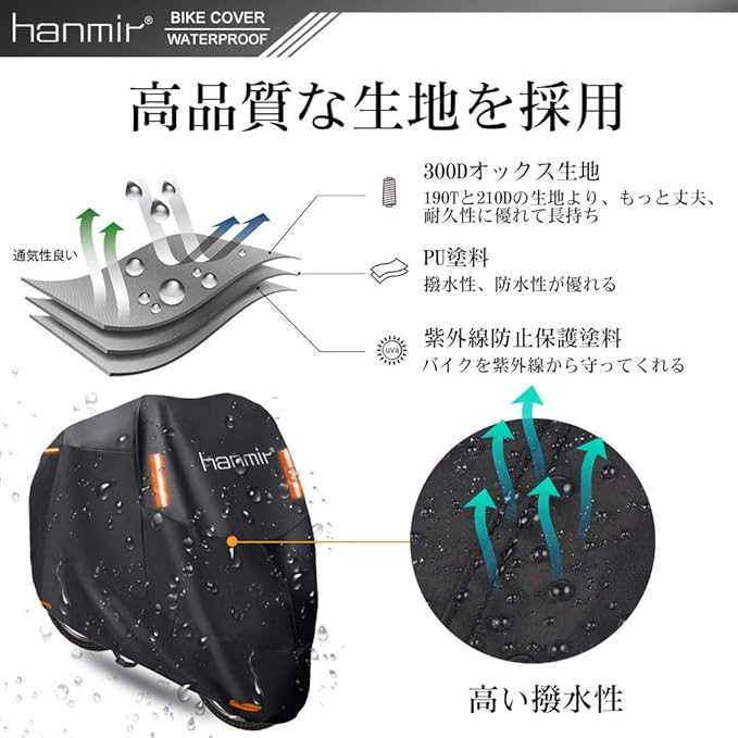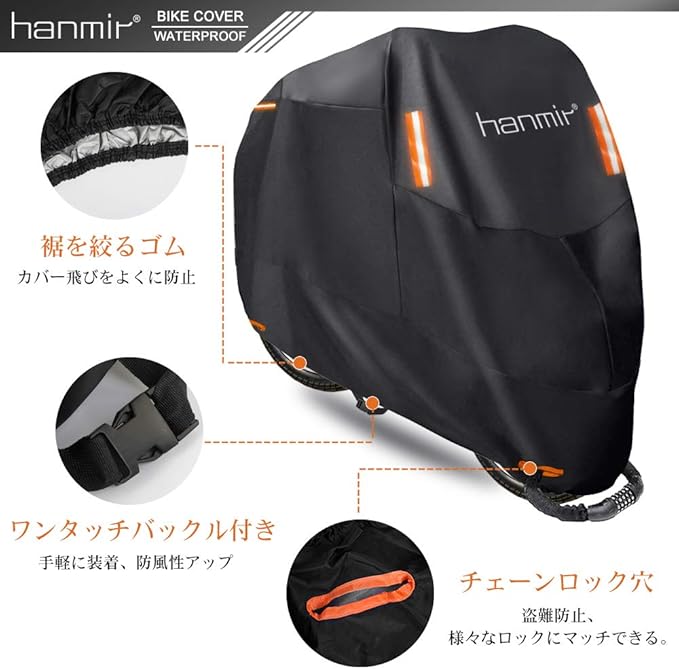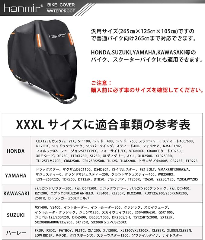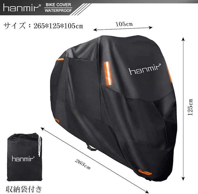 Hanmir バイクカバー 原付カバー 300D厚手 バイクカバー大型 耐熱 防水 撥水 紫外線防止 盗難防止 防風 防埃 防雨 防雪 265㎝まで対応 収納バッグ付き (XXXL ブラック)
