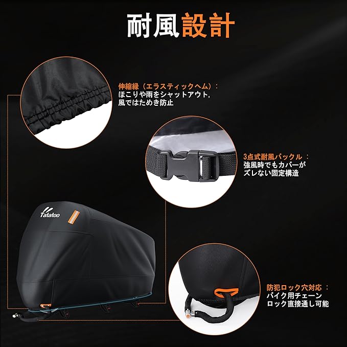 【防風機能】 Tatatoo バイクカバーは、前中後の下部に配置された3つの調整可能な防風バックルを備えています。これにより、風の強い日においてもカバーがしっかりとバイクにフィットし、風の侵入を最小限に抑えます。調整可能な長さによって、バイクとカバーの密着度を最適化し、風によるカバーのはずれや振動を防止します。安定性を確保し、バイクの外部部品や塗装を風から守ることができます。