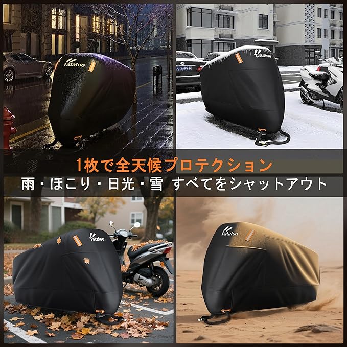 Tatatoo バイクカバー【新アップグレード版!留めベルトが3箇所あり、前後2つの穴付きの全天候型】厚手 防水 紫外線防止 風飛び防止 盗難防止 立体裁断 二重縫製 破れにくい バックル前中後付き 収納バッグ付き 汎用型 125cc/250cc 中型/大型バイク対応