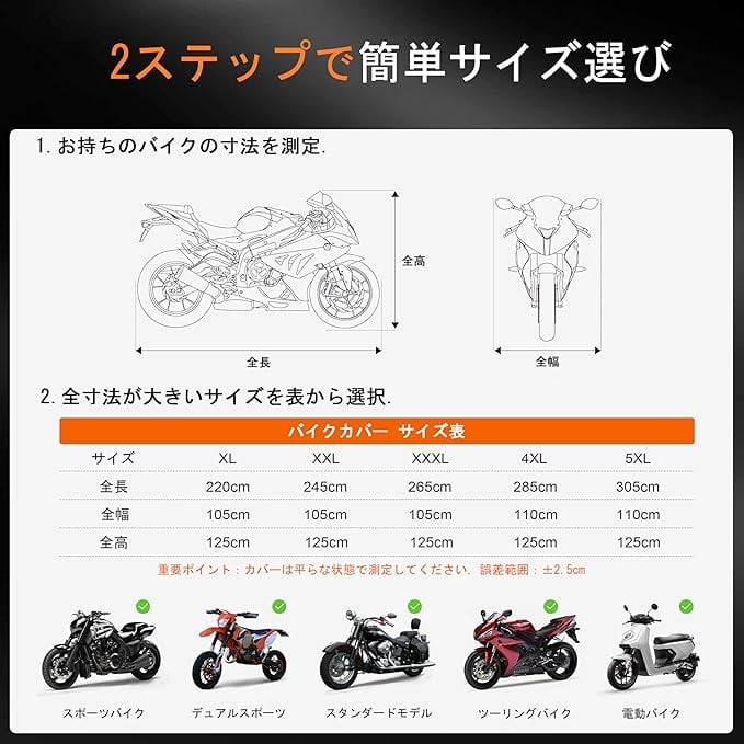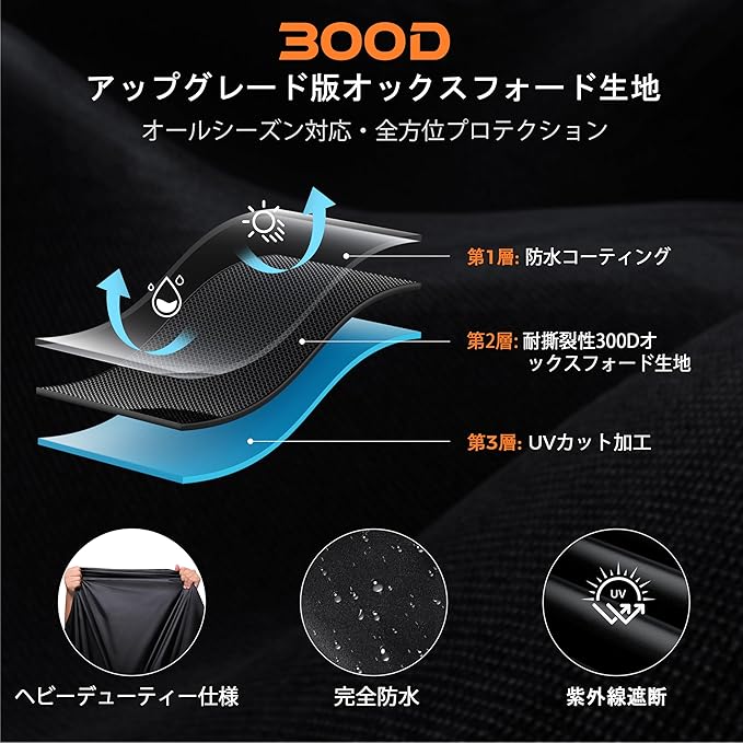 【防水機能】 防水加工が施された高品質210D防水素材を使用しており、雨や水しぶきからバイクを効果的に保護します。突然の天候変化による損傷や腐食からバイクを守り、長期間にわたり美しい状態を保つことができます。