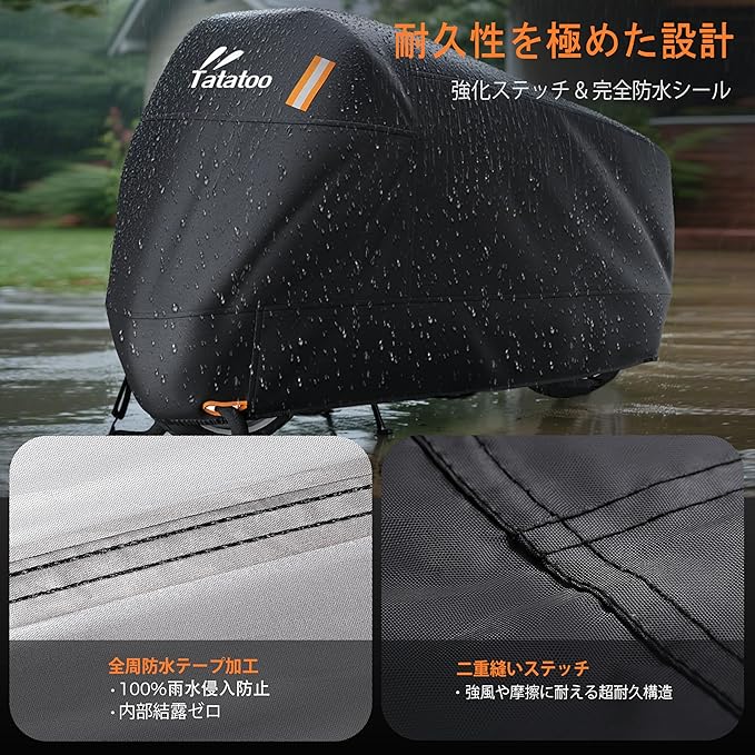 【耐久性素材】アップグレード版の210D耐久性オックスフォード生地素材を使用したTatatoo バイクカバーは、優れた耐久性と長寿命を実現しています。 この高品質な素材は、摩擦、引っかき傷、日常的な使用に対して耐久性があり、バイクを長期間にわたり保護します。 さまざまな外部要因からの損傷や劣化を防ぎ、バイクの美観と耐久性を確保します。