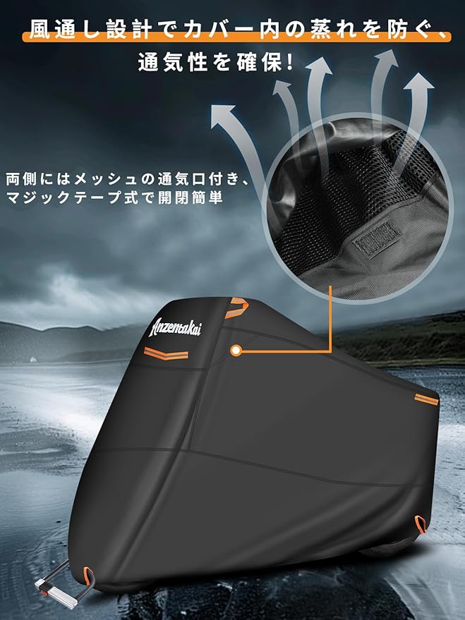 【4重防風対策と通気口の設計】風飛び防止ベルトをカバー下部中心に設置しております、ロック穴、裾を絞るゴム、ワンタッチバックルと付属2.5m防風ベルトの4重効果で、バイクを強風から守ります。前方左右ミラー位置に通気口があり、雨天走行後の蒸れやすい状況でも通気性を確保し、錆・腐食の防止効果、雨上がりや梅雨時期でもバイクを乾燥した状態に保ちます