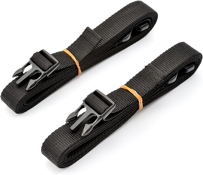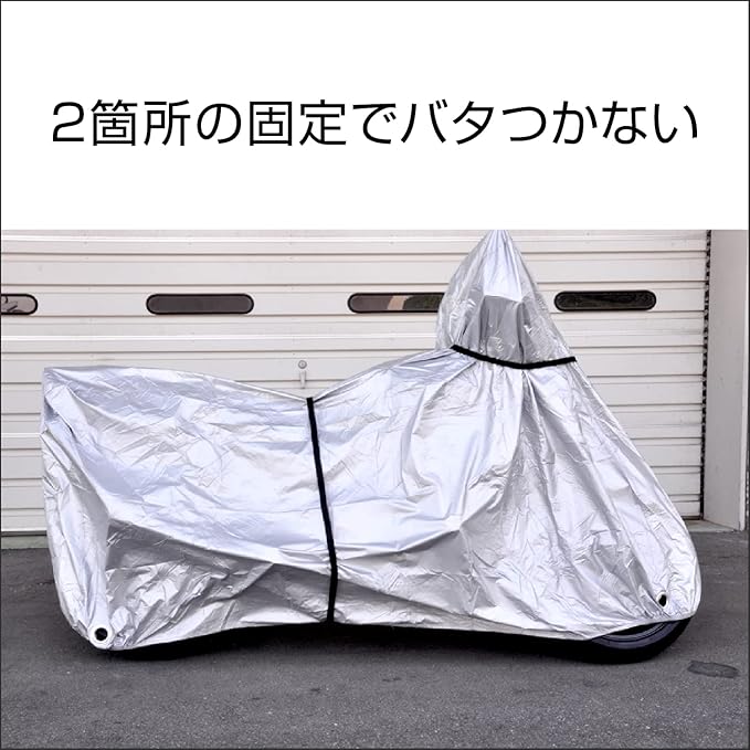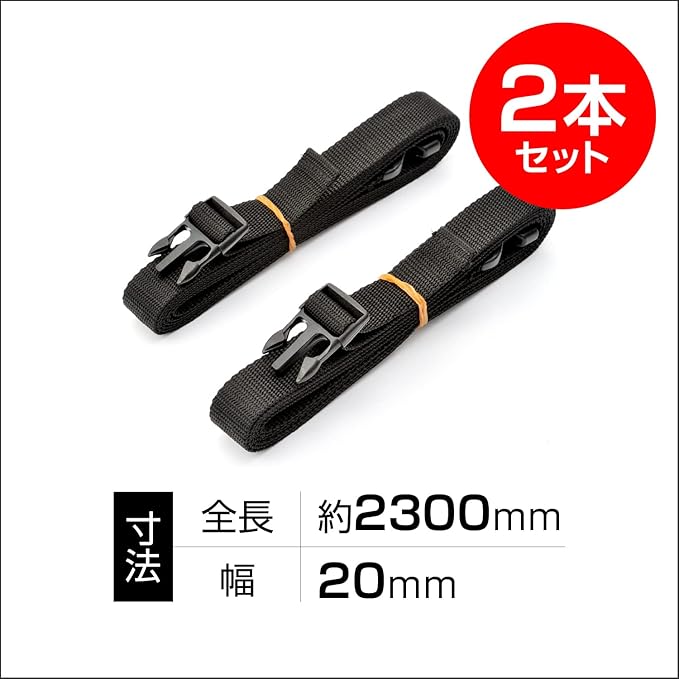 風でバタつくバイクカバーを固定するためのバンド。2本セット。全長約230cm。※淡濃色の車両はバイクカバーとのこすれによる汚れが付着する場合があります。※タンクシートカウルの角部は締め過ぎに注意してください。