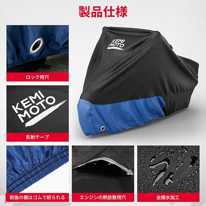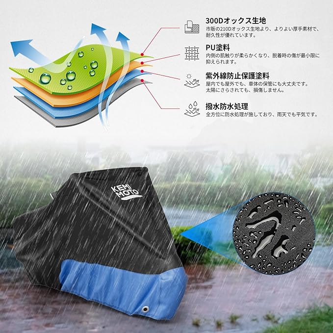 【全撥水加工】全方位に防水処理が施しており、内面はウレタン塗料とUVカット塗料でコーティングされており、ウレタン塗料を使用すると耐水性に優れ、内面の肌触りが柔らかくなり、脱着時の傷が最小限に抑えられます。また、 紫外線防止コーティングはバイク本体を紫外線から守る効果があります。