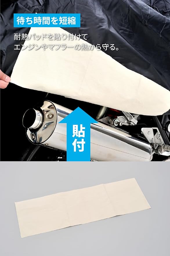 ・耐熱パッド付属:マフラーの熱からバイクカバーを守る耐熱パッド(23 70cm)付属。バイクのマフラー位置に合わせて、バイクカバー内 側に貼り付けて使用します。