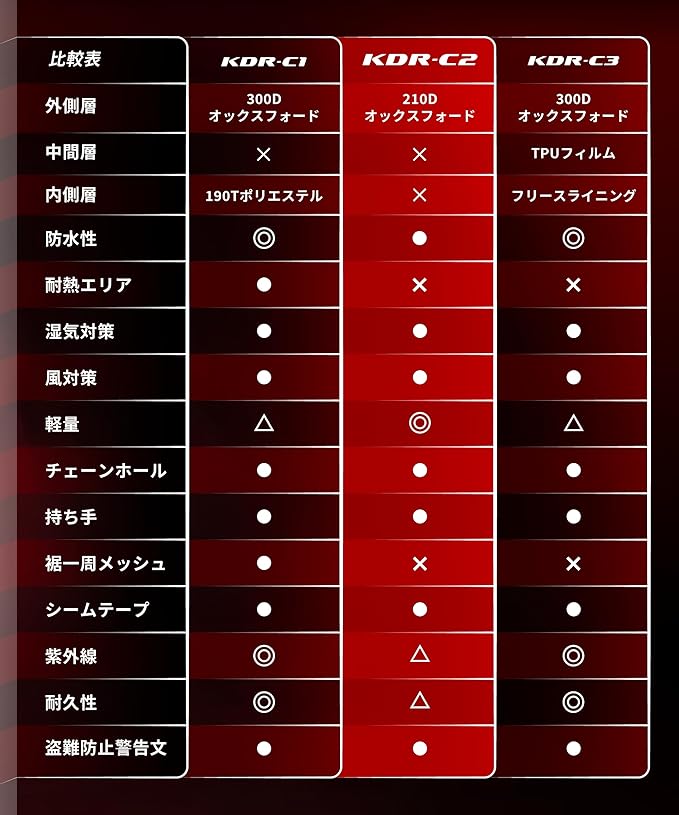 【シンプルで扱いやすい1層構造】 ● 軽量な210Dオックスフォード生地を採用し、シンプルな1層構造ながら、雨や紫外線、埃から愛車を保護します。軽量でかさばらず、収納や持ち運びがしやすいため、手軽に使用できます。 ● カバー本体には撥水加工を施し、表面の水を弾きやすい仕様。ただし、長時間の雨や経年劣化により撥水効果が低下する可能性があるため、防水スプレーなどのメンテナンスを推奨します。 ● 前方左右ミラー位置には通気ダクトを配置し、内部の通気性を確保。雨天走行後の蒸れを軽減し、錆や腐食のリスクを抑えます。 ● 縫い目には二重縫製を採用し、裏面にはシームテープを使用することで水の侵入を防ぎます。 ● バイクカバー本体にはセキュリティ警告文を印字し、視覚的な威嚇効果によって防犯性を高めています。 ※耐熱生地は使用されておりません。