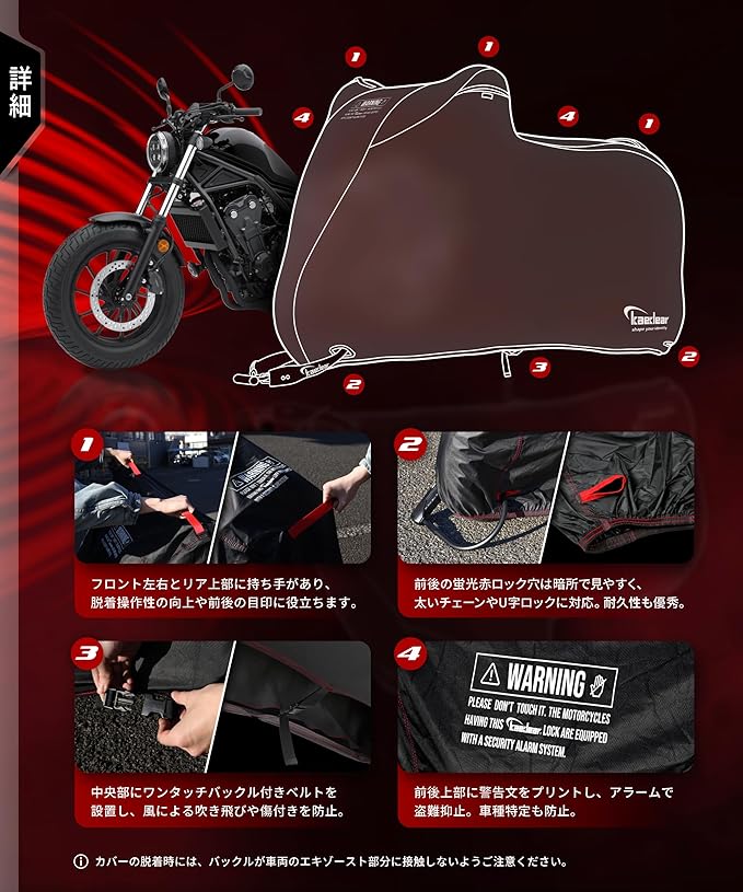 【その他の機能性】 ● 前後ロック穴は蛍光色(赤)を採用し、夜間や暗い場面でも視認性を確保。直径10cmのスリット型ロック穴は、太いチェーンロックやU字ロックに対応し、耐久性にも優れます。 ●フロント左右とリア上部に持ち手があり、脱着操作性の向上や前後の目印に役立ちます。 ● カバーの裾は伸縮性のあるゴム製で、ボディにしっかりと密着します。バイク全体を包み込むように覆うことで、隙間から入り込む埃や小石による傷を防ぎます。また、水の侵入を防止し、錆や腐食の発生も抑えます。 ● カバーの中央部には風飛び防止用のワンタッチバックル付きベルトが設置されており、強風による吹き飛びやバタつきによる傷付きを防ぎます。※カバーの脱着時には、バックルが車両のエキゾースト部分に接触しないようご注意ください。