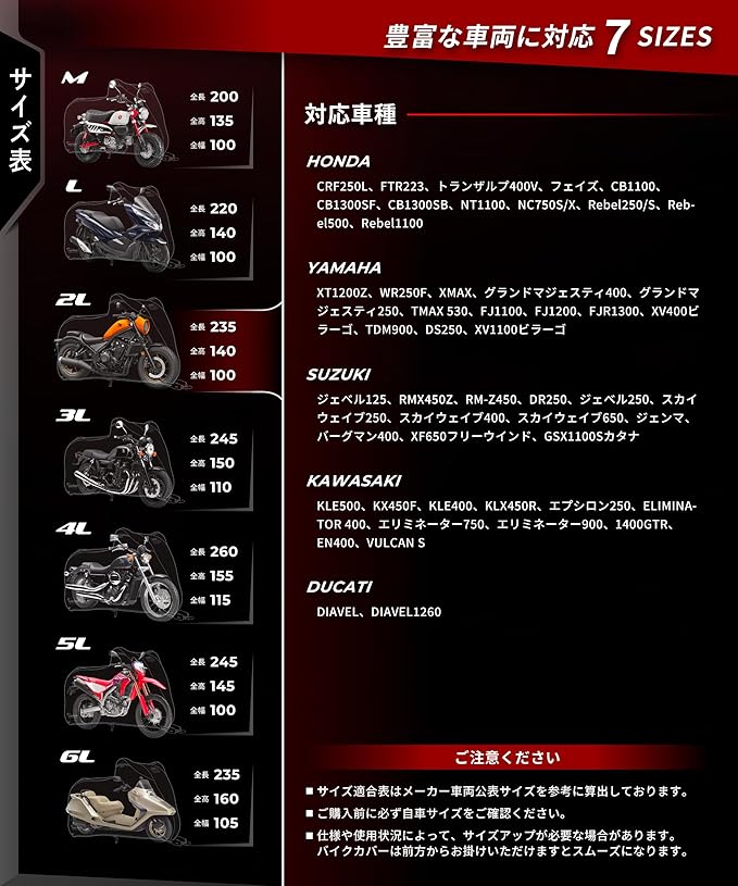 【商品詳細】 ■材質:オックスフォード210D ■商品内容:バイクカバー、収納袋 ■サイズ:KDR-C2-M(200 135 100)、KDR-C2-L(220 140 100)、KDR-C2-2L(235 140 100)、KDR-C2-3L(245 150 110)、KDR-C2-4L(260 155 115)、KDR-C2-5L(245 145 100)、KDR-C2-6L(240 160 105) ※本製品は深さのある設計のため、リアケースを装着しているバイクにも対応できる場合が多くなっています。ご使用のバイクに適合するか確認するために、地面からリアケース上部までの高さを測定し、カバーのサイズと比較してください。 ※参考適合車種はメーカー車両公表サイズを参考に算出しております。ご購入前に車体のサイズを必ずご確認ください。 ※カバーを掛ける際の前後の目印は持ち手、またはリア側のロック穴周辺のカエディアロゴを参考にしてください。