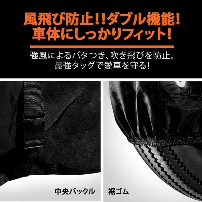 【バックルベルトと前後裾部分のゴム】バイクにしっかりフィットするよう、カバー中心にバックルベルトを、前後の裾部分にゴムをプラス。強風でも耐えられる、フィット感と強度を上げたバイクカバー。