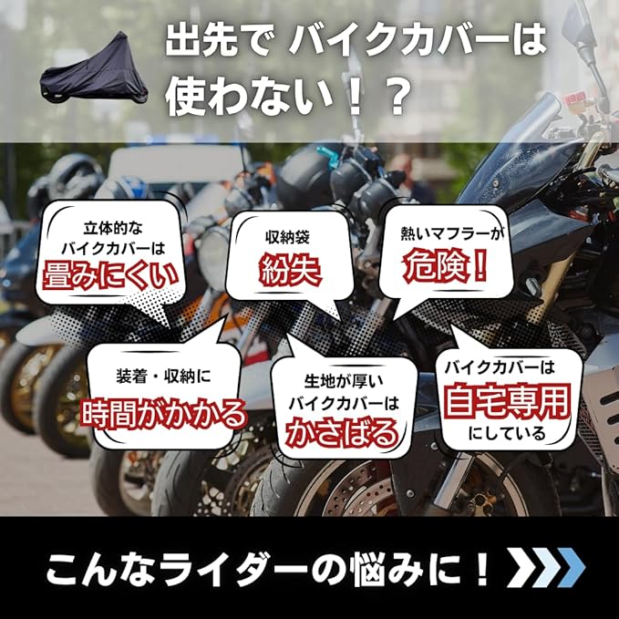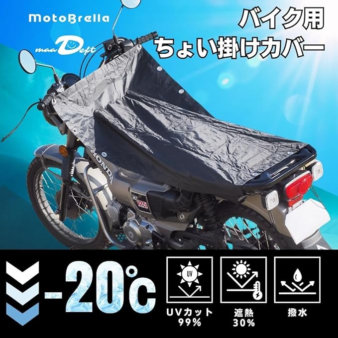 【バイク用ちょい掛けカバー新登場!】お出かけ中の一時駐車、熱くなるシートやタンク、我慢していませんか?お出かけ時に使いやすい、バイクのトップだけを覆うカバーです。紫外線・熱・雨・霜・花粉・黄砂の対策に。