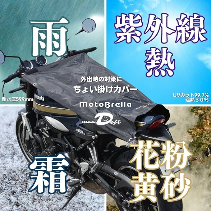 maaDeft | MotoBrella(モトブレラ)バイク用ちょい掛けカバー【遮熱・UVカット・撥水・軽量・コンパクト】外出時の駐車に!紫外線・熱・雨・花粉・黄砂対策。収納袋一体型/汎用サイズ/バイクカバー/トップカバー