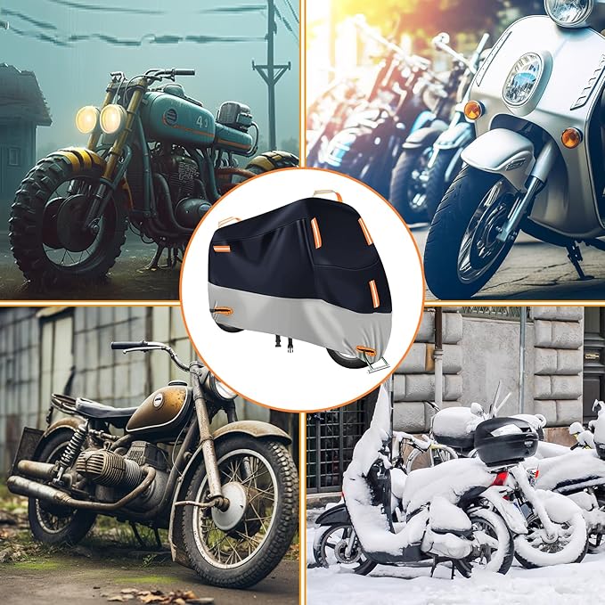 バイクカバー 原付カバー 420D厚手 防水・耐熱・溶けない 車体カバー 大型/原付対応 汎用 破れにくい 盗難防止ロック穴 裾を絞るゴム 超撥水 紫外線防止 防風 防埃 防雨 防雪 収納バッグ付き(ブラック+ シルバー)