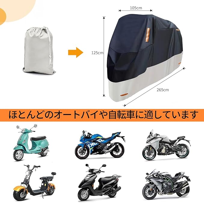 ●【ユニバーサルフィット】XL サイズは、ハーレーダビッドソン、ホンダ、スズキ、カワサキ、ヤマハなどを含む、さまざまな標準サイズのオートバイに適合します。 最大245*105*125cmの寸法で、ほとんどのオンロードおよびオフロードの標準サイズのバイクに最適なバイクカバーとなり、優れたバイクカバーをお求めの方に最適です。