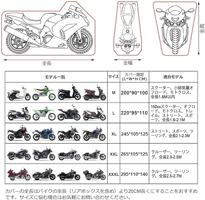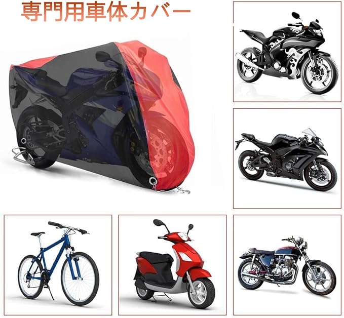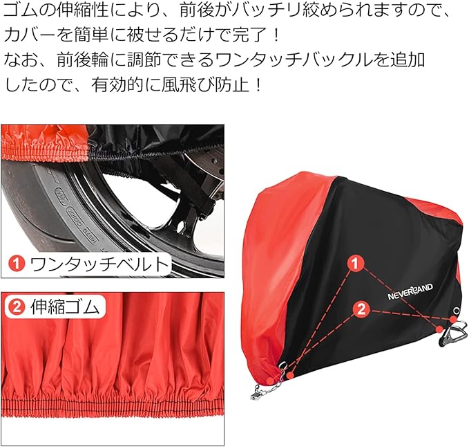 【風飛び防止& 色褪せにくい】--- 前後の底部は伸縮性ゴムで作られ、調節ができます。しかも、前後輪に高品質ワンタッチバックルが追加して、ダブル縛りになりました。ご愛車をしっかり包まれ、有効的に風飛び防止し、風で飛ばされる心配がありません。複数の染色堅牢度試験で確認済み、色褪せの心配がありません。 紫外線や傷、経年劣化にも強く、埃や熱、樹液、有害な紫外線、悪天候からバイクを上から下まで保護します。