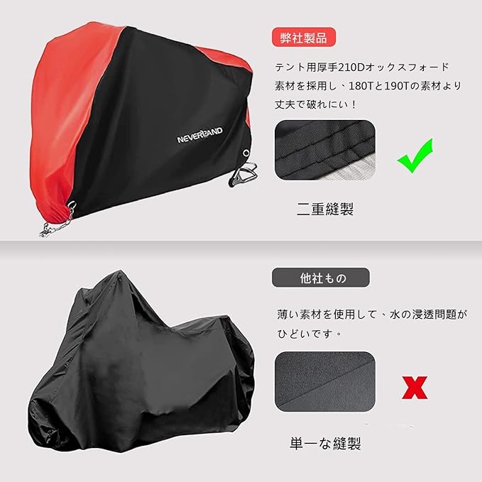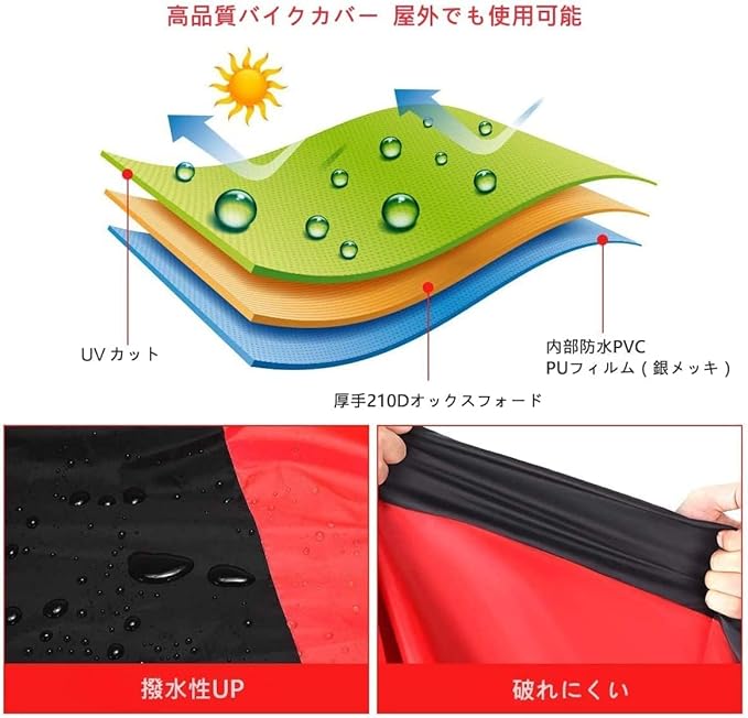 【210Dオックスフォード素材 & 防水通気】 --- テント用厚手210Dオックスフォード素材を採用し、180Tと190Tの素材より丈夫で破れにくく、耐久性が長くなりました!さらに、弊社製品の耐水圧もレベル2000に達し、内層にも防水PU膜(銀メッキ)を追加しており、他の製品より水の浸透問題を解決され、 大雨の中でもバイクは濡れません。◆◆◆ご注意:完全防水ではありません。雨量によって長時間雨にさらすとしみる可能性もあります。予めご了承ください。