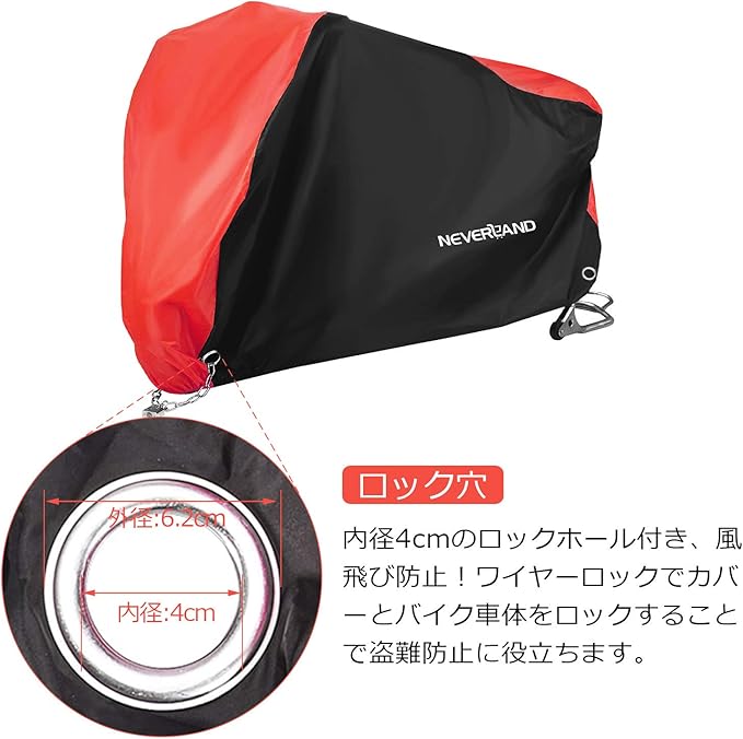 【盗難防止 & 収納袋付き】---NEVERLANDバイクカバーには前後輪盗難防止用セキュリティロック穴が用意しております(内径4cmぐらい)。各種なロックに適合しますので、 バイクの屋外保管に最適です。また、便利な収納袋が付いて、カバーが使用しない時は収納袋に入って、スペースを節約すろことができます。