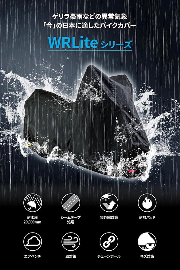 一般的なバイクカバーの10~20倍の耐水性能を誇る耐水圧20,000mmの生地を使用。縫い目には水の侵入を防ぐ止水処理
