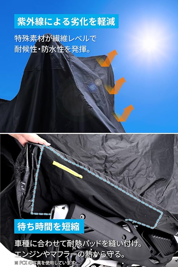 ※ 直射日光や風雨、砂ぼこり等から車両を保護することによりバイクカバーは必ず経年変化が発生します。使用状況により異なりますが、色あせする場合があります。