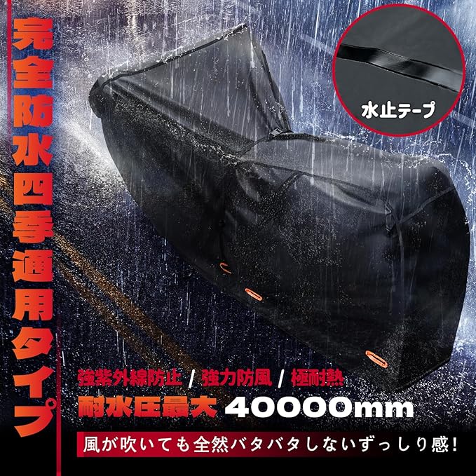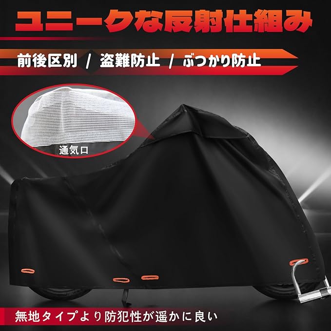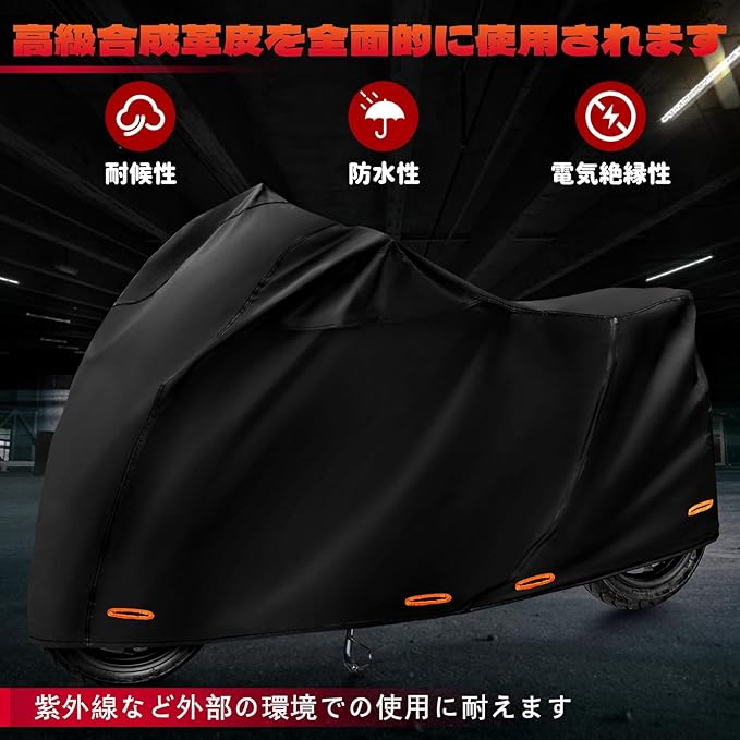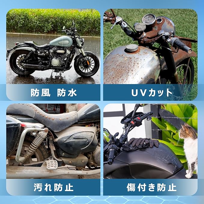 ✅【新素材】「裏起毛生地」使用:この商品の裏面全体が不織布起毛生地を使用する。カバーを着脱する際や風が吹いた時に車体に擦れて、塗装に傷つくことが防げます。✅起毛生地は水吸収能力があり、昼夜温差の酷い時の湿気こもりと雨が降った後の蒸れで形成した水を吸収し、チェーン等の錆びの発生も防げます。