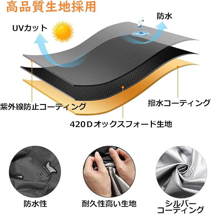 『高品質な生地・耐久性』バイクカバーは、210D・190Tより丈夫で摩擦に強い420Dオックスフォード生地を採用、強度さあり耐久性が高いです。雨の日であっても、雪の日であっても、愛車をしっかりお守ります。
