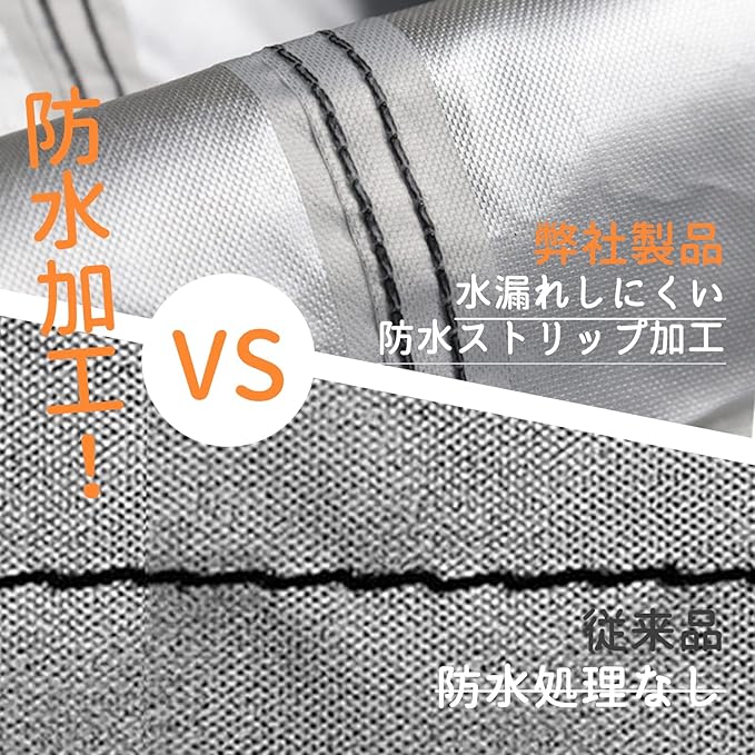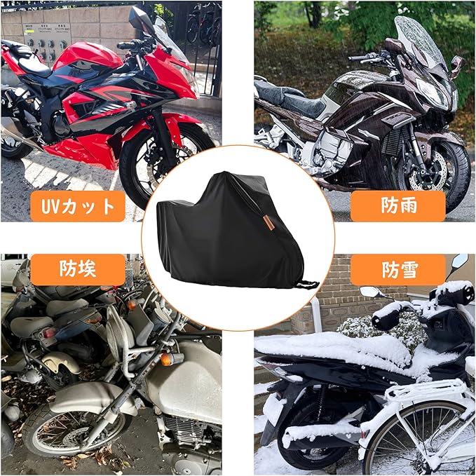『防水性・防風設計』バイクカバーの縫製部分に防水ストリップが追加され、雨水の浸透など針穴からの水漏れを防止します。また、裏面にも防水塗料を塗り、優れている防水性・撥水性の上、UVカット効果もあります。バイクカバーの底に伸縮性のある丈夫な裾と調節可能なバックルが設けされ、取り付けと取り外しが便利だけでなく、強風から保護カバーが吹き飛ばされるのを防ぐことができます。