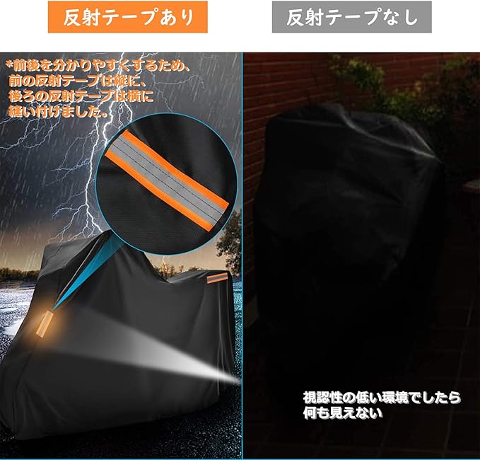 『盗難防止・夜間反射テープ』前後輪エリアに防盗用のロック穴が設計され、保護カバーを付けても、ケーブル、チェーンあるいはU/Dロックが使用できます。カバー反射テープは前後四枚あり、視認性の低い環境でも、駐車所など所からバイクを簡単に見つけることが出来ます。また、前後が分かりやすくするために、前の反射テープは縦に、後ろの反射テープは横に縫いつけました。