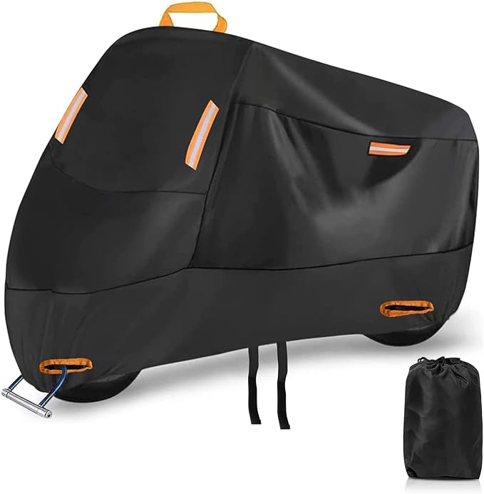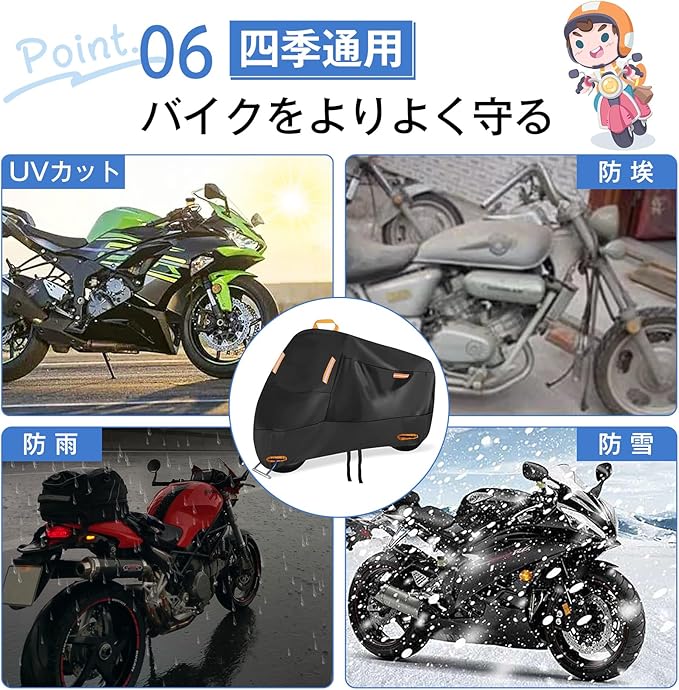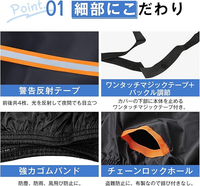 【シームテープ付き&UVカット抜群】バイク車体カバー裏面は縫い目、針穴からの浸水をシームテープで防水処理しております。雨だけでなく、雪や埃や汚れやサビからも自転車を守ります。そして、UV カット加工、難燃加工を施しており、車体が劣化しにくく、もしもの火災からも守します。