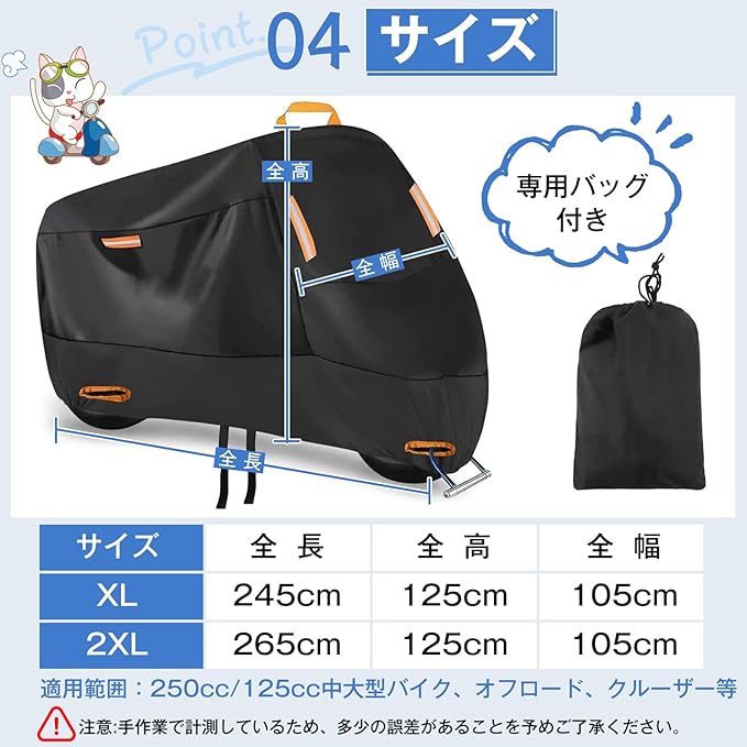 【サイズ】:収納バック付き、XL:全長245cm 全高125cm 全幅105cm、2XL:全長265cm 全高125cm 全幅105cm、スクーター、モトクロス、オフロード、トレイル、ストリート、スポーツ、ツーリング、クルーザー等のバイク対応(250cc、125cc問わず)