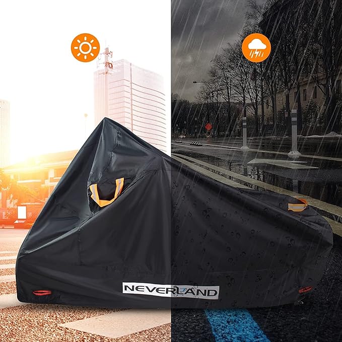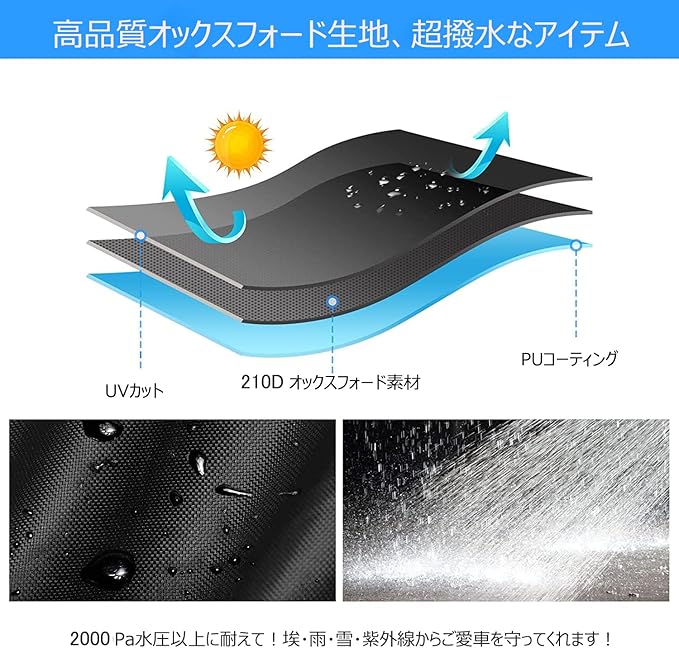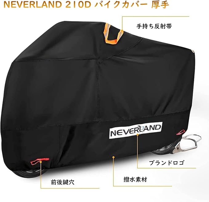 ▶【高品質210D素材 日本国内生地品質検査済】NEVERLANDが開発した新しいバイクカバーは、テント用210Dオックスフォード素材を採用し、精密な二重縫製で、180Tまたは190Tの素材より丈夫で破れにくく、耐久性が長くなりました!さらに、NEVERLAND バイクカバーの耐水圧レベルが2000以上に達し、撥水/遮光/防塵/頑丈!埃・雨・雪・直射日光等からご愛車をお守ります!