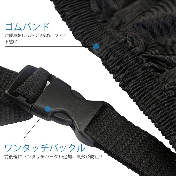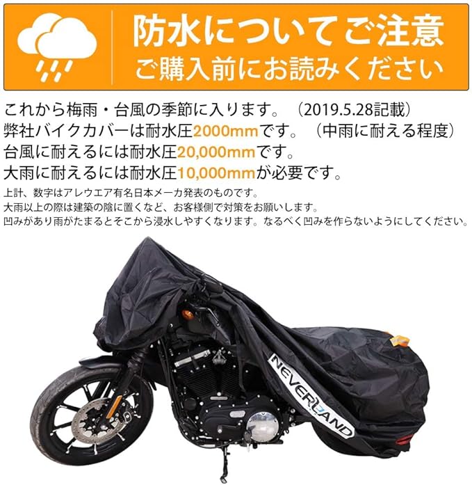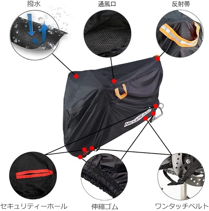 ▶【撥水&通気 風飛び防止】弊社の車体カバーに両側のミラー部分に通風口が付き、カバー内部の熱気と湿気を減らせ、錆にくいです。また、NEVERLANDカバーに前後輪とも伸縮性ゴムが付いていて、調節でき、ご愛車をしっかり包まれます。ダブル縛りデザインで、有効的に風飛び防止し、風で飛ばされる心配がありません。