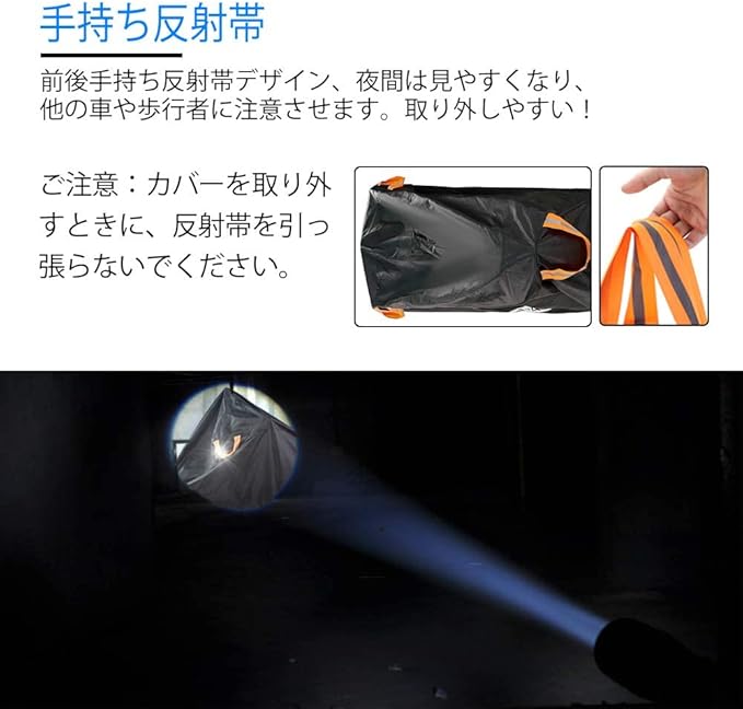 ▶【前後手持ち反射帯デザイン】NEVERLAND 原付バイクカバーの反射帯は手持ちタイプなので、取り外しやすいし、夜間にも見やすくなり、他の車や歩行者に注意させます。複数の染色堅牢度試験で確認済み、色褪せの心配がありません。 裏側は50+UV加工を施しているため、紫外線や傷、経年劣化にも強く、埃や熱、樹液、有害な紫外線、悪天候からバイクを上から下まで保護します。