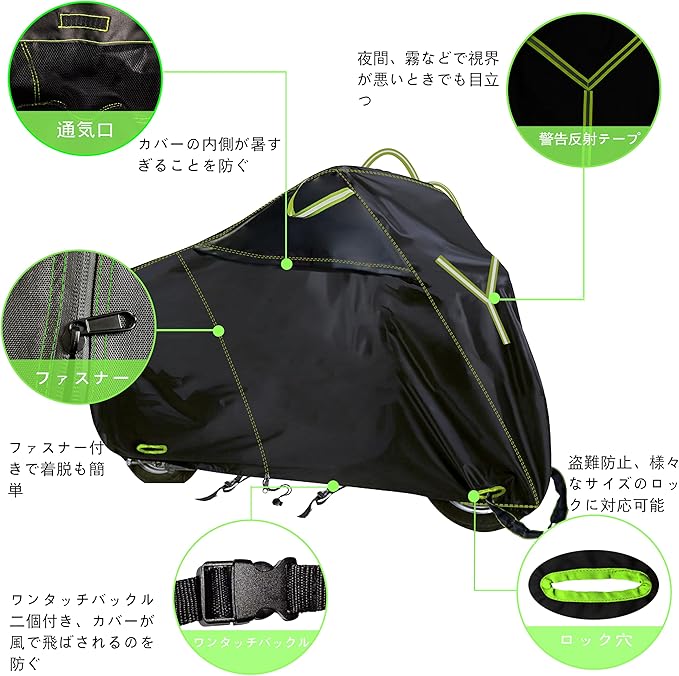 バイクカバー 900D 超厚手 完全防水 柔らかい UVカット 大型 盗難防止 ロック穴付き 耐熱 耐久 撥水 防風 防雨 防埃 防雪 原付 バイク用車体カバー グリーン糸 (L)